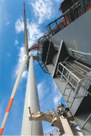 吊臂高懸,機(jī)聲如潮。直徑136米、重近100噸的“巨無(wú)霸”風(fēng)力發(fā)電機(jī)葉輪被高高擎起,與矗立海面約30層樓高的機(jī)艙精密對(duì)接……昨天上午,如東環(huán)港新閘外10公里海域,隨著江蘇龍?jiān)凑袢A海洋工程公司順利完成國(guó)內(nèi)近海第一臺(tái)單管樁風(fēng)機(jī)施工,困擾我國(guó)海上風(fēng)電業(yè)界多年的施工難題終被突破:30米以?xún)?nèi)水深近海風(fēng)電施工,已從昔日受潮汐影響制約,變成了如今作業(yè)“全天候”。