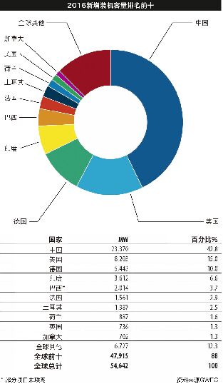 4月25日全球風(fēng)能理事會在發(fā)布的《全球風(fēng)電報告:年度市場發(fā)展》中指出,2016年全球風(fēng)電新增裝機(jī)容量超過54GW,相比2015年增速有所放緩,其中中國繼續(xù)大幅領(lǐng)先風(fēng)電新增裝機(jī)和累計裝機(jī)量,名列全球第一,同時中國累計裝機(jī)量約是第二名美國的兩倍,新增裝機(jī)量約是美國的四倍。 該全球風(fēng)能理事會的預(yù)測顯示,2017年全球風(fēng)電年新增裝機(jī)有望達(dá)到60GW,且增長主要由亞洲國家引領(lǐng)。 2021年新增容量將增至75GW 具體而言,2016年全球風(fēng)電新增裝機(jī)容量超過54GW,這些裝機(jī)容量分布在90個國家,其中9個國家的裝機(jī)容量超過10GW,29個國家的裝機(jī)容量達(dá)到1GW,累計裝機(jī)容量增長12.6%,累計容量達(dá)到486.8GW。