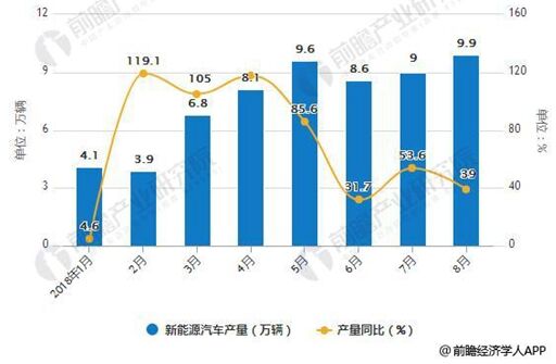 2018年1-8月新能源汽車產(chǎn)銷量統(tǒng)計及增長情況