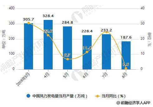 2018年1-8月中國(guó)風(fēng)力發(fā)電量產(chǎn)量統(tǒng)計(jì)及增長(zhǎng)情況