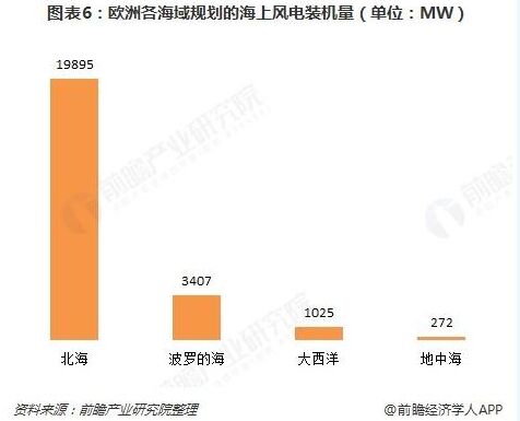 ——發(fā)電量 歐洲海上風(fēng)能發(fā)電量將隨著裝機容量的增長而提高,到2020年,海上風(fēng)力發(fā)電量將達到1482億千瓦小時,占歐洲風(fēng)力發(fā)電量的四分之一,相當(dāng)于歐洲電力消費量的4%-4.2%。2030年,海上風(fēng)力發(fā)電量將達到5620億千瓦小時,占歐洲風(fēng)力發(fā)電量的一半,相當(dāng)于歐洲電力消費量的13.9%。 ——區(qū)域分布 北海海域擁有豐富的海上風(fēng)能資源,將成為近期發(fā)展的重點區(qū)域,規(guī)劃的海上風(fēng)電裝機量比重約為19895MW。另外,一旦法國在大西洋的一些項目得到批準,大西洋的裝機量就會增加3GW。而地中海地區(qū)雖然一些項目已經(jīng)獲得批準,但是地中海區(qū)域裝機量在2020年之前并不會有明顯增長趨勢。