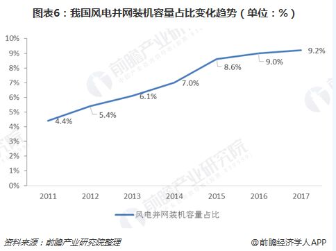 近年來,風(fēng)電并網(wǎng)裝機(jī)容量在發(fā)電設(shè)備裝機(jī)總量中的占比不斷提高,整體呈現(xiàn)逐年上升的趨勢。我國風(fēng)電并網(wǎng)裝機(jī)容量占全部發(fā)電設(shè)備裝機(jī)容量的比例由2011年的4.4%上升至2017年的9.2%。根據(jù)國家統(tǒng)計局?jǐn)?shù)據(jù)顯示,2017年,風(fēng)電發(fā)電量約為3057億千瓦時,約占全社會用電量的4.8%,風(fēng)力發(fā)電已成為我國清潔能源發(fā)電方式中不可缺少的一部分。 2017年我國風(fēng)電并網(wǎng)裝機(jī)容量占全部發(fā)電設(shè)備裝機(jī)容量的比例為9.2%,低于全球清潔能源裝機(jī)量(含水電)占全部裝機(jī)量的比例,去除水電部分,按單個國家來看,我國風(fēng)電并網(wǎng)裝機(jī)容量仍排在全球前列。