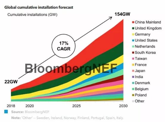 隨著海上風電開發(fā)商在亞洲和美國迅速的拓展,歐洲在這一領(lǐng)域所占據(jù)的主導(dǎo)地位正逐漸削弱。本世紀20年代,新興GW級市場如中國臺灣地區(qū)、美國、日本與韓國,將加入包括英國、荷蘭、德國與中國大陸在內(nèi)的成熟市場隊列。 彭博新能源財經(jīng)預(yù)測,從今天起至2030年,全球海上風電市場的年復(fù)合增長率將達17%。并且,2030年全球海上風電的累計裝機容量將達154GW,這一數(shù)字較2018年上半年海上風電市場展望報告中預(yù)測的數(shù)值提高了19%。