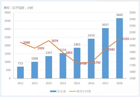 圖2 2011-2018年我國(guó)風(fēng)電發(fā)電量及利用小時(shí)數(shù)情況