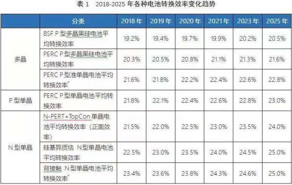 近幾年,在政策和市場(chǎng)雙輪驅(qū)動(dòng)下,骨干企業(yè)加大了工藝研發(fā)和技改投入力度,生產(chǎn)工藝水平不斷進(jìn)步,高效電池技術(shù)不斷發(fā)展。 2018年,各種電池技術(shù)平均轉(zhuǎn)換效率方面,規(guī);a(chǎn)的多晶黑硅電池的平均轉(zhuǎn)換效率達(dá)到19.2%,使用PERC電池技術(shù)的單晶和多晶黑硅電池效率提升至21.8%和20.3%,較2017年分別提升0.5個(gè)百分點(diǎn)和0.3個(gè)百分點(diǎn),N型PERT單晶電池平均轉(zhuǎn)換效率已經(jīng)達(dá)到21.5%。雙面N型PERT電池和異質(zhì)結(jié)(HJT)電池已進(jìn)入量產(chǎn),并且會(huì)成為未來(lái)發(fā)展的主要方向之一。下表給出了2018-2025年不同類(lèi)型電池轉(zhuǎn)換效率變化趨勢(shì)。