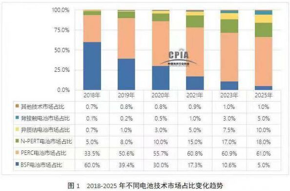 2018年,各種電池技術(shù)市場(chǎng)占比方面,BSF電池(常規(guī)電池及多晶黑硅電池結(jié)構(gòu))仍占據(jù)大部分市場(chǎng)份額,但相比2017年83%的占比已下降了23個(gè)百分點(diǎn),隨著新技術(shù)的發(fā)展其占比將逐年減少;PERC電池是當(dāng)前產(chǎn)能最大的高效電池,2018年市場(chǎng)份額占比大幅增加,達(dá)到33.5%左右,預(yù)計(jì)明年P(guān)ERC電池市場(chǎng)占比將反超BSF電池,成為市場(chǎng)占比最高的電池種類(lèi)。雙面N型PERT電池、背接觸(IBC)電池、異質(zhì)結(jié)(HJT)電池等新型高效電池市場(chǎng)份額將逐步提高,其中N-PERT電池未來(lái)將成為市場(chǎng)占比第二的電池種類(lèi)。下圖給出了2018-2025年不同電池技術(shù)市場(chǎng)占比的變化趨勢(shì)。