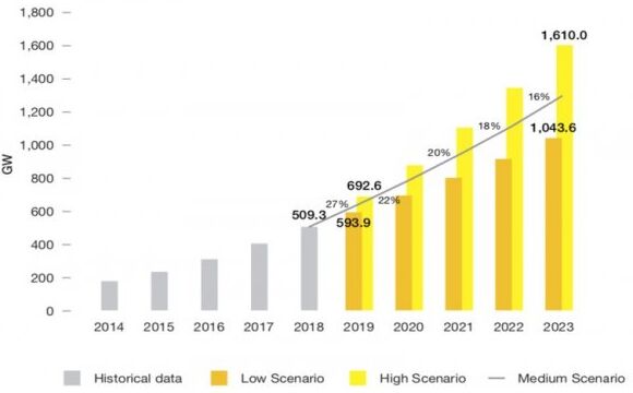 全球太陽(yáng)能光伏市場(chǎng)展望2019-2023。來(lái)源:SolarPower