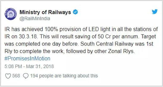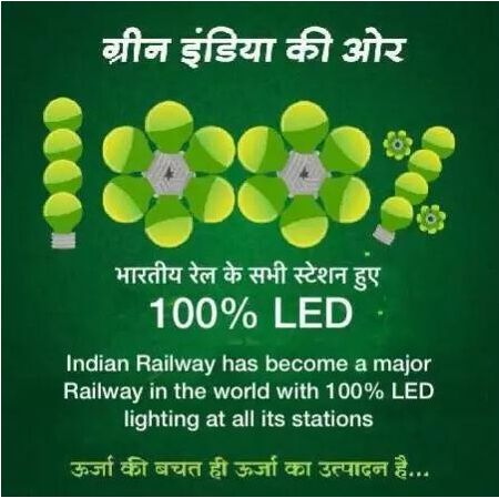 3月30日,印度鐵路在官方推特上宣布,已在印度鐵路的所有車站實現(xiàn)了100%的LED照明供應。此舉將每年節(jié)省50億盧比(約4.8億人民幣)。