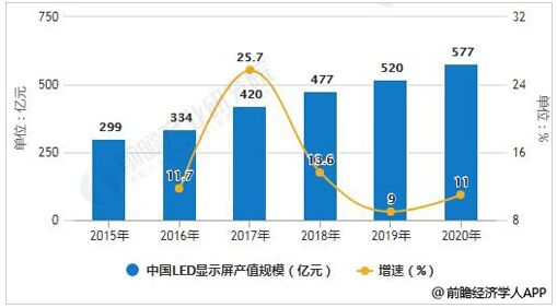 2015-2020年中國LED顯示屏產(chǎn)值規(guī)模統(tǒng)計及增長情況預(yù)測