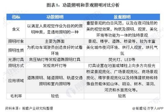功能照明和景觀(guān)照明為我國(guó)照明工程兩大市場(chǎng) 照明工程行業(yè)主要可分為功能照明和景觀(guān)照明,由于目的性不同,兩大細(xì)分市場(chǎng)在照明對(duì)象、照明性質(zhì)、光源燈具和照明方式等均有所不同,在應(yīng)用領(lǐng)域也各有側(cè)重。 具體來(lái)看,功能照明以滿(mǎn)足人類(lèi)視覺(jué)作業(yè)為主要目的,因此其應(yīng)用領(lǐng)域主要為道路照明、隧道照明、軌道交通照明和室內(nèi)照明等,行業(yè)毛利率較低;而景觀(guān)照明主要以重塑景觀(guān)的白日風(fēng)范,以及呈現(xiàn)美的視覺(jué)效果為目的,具備觀(guān)賞和美化環(huán)境的作用,因此其應(yīng)用場(chǎng)景主要為橋梁景觀(guān)亮化、廣場(chǎng)景觀(guān)亮化、商場(chǎng)景觀(guān)亮化、樓宇景觀(guān)亮化以及特殊建筑物和特殊自然載體如山體、胡泊、樹(shù)木、溶洞、河流和水面亮化等。