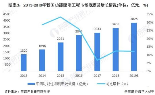 功能性照明:智能化是未來(lái)趨勢(shì) 2013-2019年,我國(guó)功能照明市場(chǎng)實(shí)現(xiàn)快速增長(zhǎng),從2013年的1320億元增長(zhǎng)至2018年的3408億元,年均復(fù)合增速達(dá)到20.8%。2019年,行業(yè)市場(chǎng)規(guī)模進(jìn)一步擴(kuò)大,達(dá)到3825億元左右。