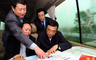 這是在前往工地途中,李克強(qiáng)聽取有關(guān)部門和企業(yè)負(fù)責(zé)人匯報。李濤攝