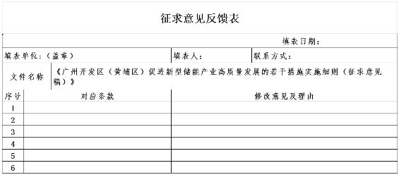 根據(jù)《廣州市黃埔區(qū)工業(yè)和信息化局、廣州市黃埔區(qū)發(fā)展和改革局關于印發(fā)廣州開發(fā)區(qū)(黃埔區(qū))促進新型儲能產業(yè)高質量發(fā)展的若干措施的通知》(穗埔工信規(guī)字〔2023〕4號),為便于政策實施,明確相關條款具體內容及操作規(guī)范,結合本區(qū)實際,區(qū)工業(yè)和信息化局起草了《廣州開發(fā)區(qū)(黃埔區(qū))促進新型儲能產業(yè)高質量發(fā)展的若干措施實施細則(征求意見稿)》(附件1),F(xiàn)依據(jù)《廣州市黃埔區(qū)、廣州開發(fā)區(qū)行政規(guī)范性文件管理辦法》(穗埔府規(guī)〔2021〕1號)有關規(guī)定,公開向社會征求意見,征求意見時間為2023年9月5日至2023年9月15日。如有意見請?zhí)顚憽墩髑笠庖姺答伇怼罚ǜ郊?)并發(fā)送至郵箱wangfeiyang@hp.gov.cn,聯(lián)系人:王飛陽,聯(lián)系電話:82113595。