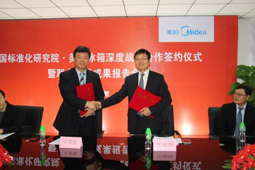 中國標(biāo)準(zhǔn)化研究院、中標(biāo)科技副總經(jīng)理王若虹與美的冰箱總經(jīng)理王建國簽署合作協(xié)議