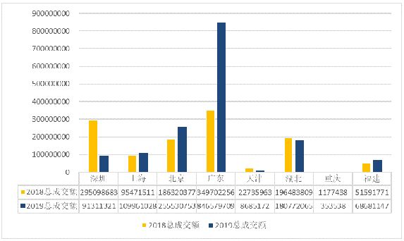 數(shù)據(jù)來源:wind. 中央財經(jīng)大學(xué)綠色金融國際研究院 圖2. 試點碳市場2018、2019年度成交總額