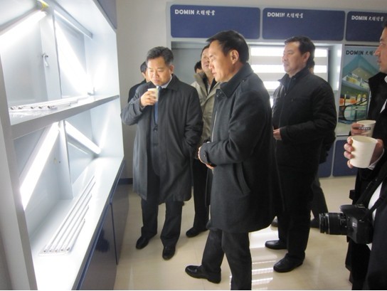 2012年3月3日上午,中國節(jié)能環(huán)保集團公司總工程師企業(yè)管理部主任鄒結(jié)富、荊州發(fā)改委主任肖夕映、荊州開發(fā)區(qū)管委會主任羅清洋等領(lǐng)導一行,在荊州大明燈業(yè)有限公司董事長倪功大、總經(jīng)理池昌明等部門經(jīng)理的陪同下,深入到大明燈業(yè)進行實地考察。中國節(jié)能環(huán)保集團在湖北投資了10 多個項目,總投資有幾十億元,其中在荊州有投資過億元的荊州市城鄉(xiāng)生活垃圾收運及固體廢棄物處理工程項目,中國節(jié)能環(huán)保集團此次到荊州來,就是要多了解荊州的產(chǎn)業(yè)政策、相關(guān)項目和資源開發(fā)的情況。  董事長倪功大向中國節(jié)能環(huán)保集團公司總工程師企業(yè)管理部主任鄒結(jié)富(左一) 一行介紹T5產(chǎn)品