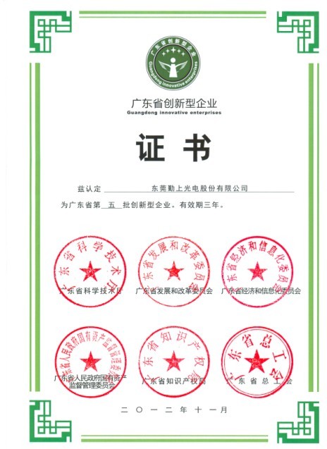 近日,經(jīng)廣東省科技廳、省發(fā)展改革委、省經(jīng)濟(jì)和信息化委、省國(guó)資委、省知識(shí)產(chǎn)權(quán)局和省總工會(huì)認(rèn)真組織評(píng)審,東莞勤上光電股份有限公司被認(rèn)定為第五批“廣東省創(chuàng)新型企業(yè)”。