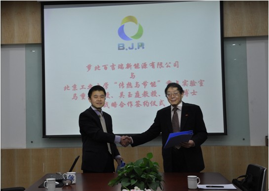 2014年4月11日,蘿北百吉瑞新能源有限公司與北京工業(yè)大學(xué)“傳熱與節(jié)能”重點(diǎn)實(shí)驗(yàn)室主任馬重芳教授團(tuán)隊(duì)關(guān)于共同開發(fā)太陽能熱電站中熔融鹽的全套蓄熱(儲(chǔ)能)系統(tǒng)產(chǎn)學(xué)研一體化深度戰(zhàn)略合作簽約儀式在北京舉行。 百吉瑞新能源將憑借北工大馬重芳教授研發(fā)團(tuán)隊(duì)的技術(shù)優(yōu)勢,采用馬重芳教授團(tuán)隊(duì)在中高溫熔融鹽傳熱、蓄熱(儲(chǔ)能)領(lǐng)域十多年的研究成果,推出擁有全部國內(nèi)獨(dú)家自主知識(shí)產(chǎn)權(quán)的熔融鹽配制、融化和蓄熱等系統(tǒng)、設(shè)備及服務(wù),進(jìn)軍國內(nèi)外巨大的太陽能熱發(fā)電市場領(lǐng)域,并以此為契機(jī)加快推動(dòng)中國熔融鹽蓄熱(儲(chǔ)能)產(chǎn)業(yè)化進(jìn)程。合作雙方百吉瑞董事長薛凌云、北京工業(yè)大學(xué)馬重芳教授均對(duì)未來前景充滿信心。業(yè)內(nèi)權(quán)威代表及相關(guān)專家對(duì)雙方合作后的技術(shù)優(yōu)勢和市場理念給予了高度評(píng)價(jià),并對(duì)其可能對(duì)國內(nèi)太陽能光熱發(fā)電熔鹽蓄熱產(chǎn)業(yè)化進(jìn)程帶來的推動(dòng)作用寄予厚望。