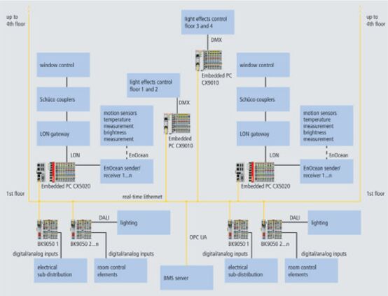所使用的通訊系統(tǒng)包括,實(shí)時(shí)以太網(wǎng)用作控制器網(wǎng)絡(luò),OPC UA 用于與服務(wù)器通訊并用作 MBE 網(wǎng)絡(luò),DALI 用于照明控制,EnOcean用于運(yùn)動(dòng)傳感器和溫度/照度測量,LON 用于窗戶控制,以及 DMX 用于燈具和照明效果控制。Michael Falkenstein解釋道:“ZVE 中有較大數(shù)量的控制器正在運(yùn)行,它們相互之間會(huì)不斷地通訊。這樣會(huì)產(chǎn)生非常高的數(shù)據(jù)量,通過實(shí)時(shí)以太網(wǎng)卻輕松處理。此外,我們已經(jīng)使用這個(gè)通訊系統(tǒng)有相當(dāng)一段時(shí)間了,因此非常熟悉它的優(yōu)點(diǎn),比如協(xié)同功能、可靠性和操作簡單。為了滿足規(guī)劃開始時(shí)需要同時(shí)集成可視化以及能源監(jiān)測等功能,因此選擇了開放性非常出色的OPC UA。此外,OPC UA的另一個(gè)優(yōu)點(diǎn)就是所有變量已經(jīng)在單獨(dú)房間控制的功能塊中存在,大大減少了工程工作量!