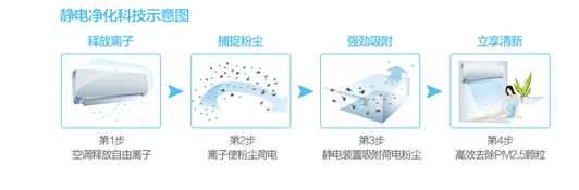 靜電除塵科技 超強(qiáng)污染吸附 美的空調(diào)通過(guò)不斷的技術(shù)研究開(kāi)發(fā),率先打造靜電除塵工藝,實(shí)現(xiàn)污染物的有效吸附。空調(diào)本體通過(guò)自由離子的釋放,使得空氣中的粉塵荷電,最終通過(guò)空調(diào)體內(nèi)的靜電裝置吸附荷電粉塵,最終去除PM2.5顆粒,實(shí)現(xiàn)空氣凈化。
