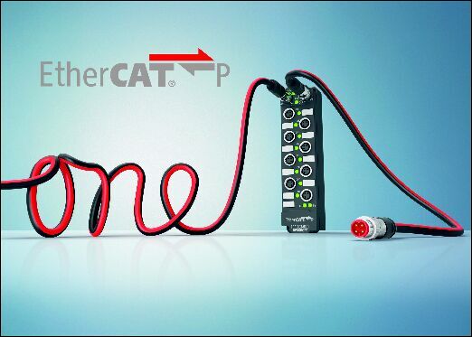 圖片注釋: 針對(duì)現(xiàn)場(chǎng)級(jí)的單電纜解決方案 — EtherCAT P將 EtherCAT 通訊以及系統(tǒng)和外圍電壓集成在一根電纜中。 。