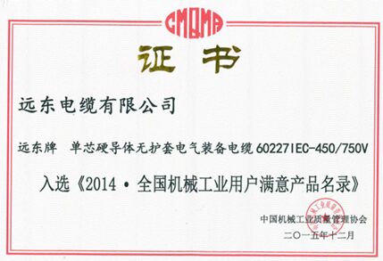 近日,由中國(guó)機(jī)械工業(yè)質(zhì)量管理協(xié)會(huì)主辦的“全國(guó)機(jī)械工業(yè)用戶滿意產(chǎn)品”評(píng)選活動(dòng)結(jié)果出爐,遠(yuǎn)東電纜有限公司的“遠(yuǎn)東”牌單芯硬導(dǎo)體無(wú)護(hù)套電氣裝備電纜和“遠(yuǎn)東電纜”牌銅芯擠包絕緣電力電纜1.5-240mm2榜上有名。