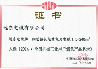 本次評(píng)價(jià)活動(dòng)以產(chǎn)品可靠性為核心,以用戶直接感知的質(zhì)量和服務(wù)為內(nèi)容,以行業(yè)地位、質(zhì)檢結(jié)論為依據(jù),以客觀公正為原則,由中國(guó)機(jī)械工業(yè)質(zhì)量管理協(xié)會(huì)組織全國(guó)性行業(yè)協(xié)會(huì)(專業(yè)協(xié)會(huì))、行業(yè)綜合排名前5位的龍頭企業(yè)、各省市行業(yè)主管部門進(jìn)行評(píng)價(jià)推薦,并采用評(píng)價(jià)表的方式對(duì)產(chǎn)品的各項(xiàng)關(guān)鍵指標(biāo)進(jìn)行定性、定量評(píng)價(jià),共篩選產(chǎn)生113項(xiàng)產(chǎn)品入選《2014.全國(guó)機(jī)械工業(yè)用戶滿意產(chǎn)品名錄(零部件)》。 長(zhǎng)期以來(lái),遠(yuǎn)東電纜始終堅(jiān)持以質(zhì)取勝,以過(guò)硬的品質(zhì)服務(wù)社會(huì)。把質(zhì)量工作放在首位,采用先進(jìn)的質(zhì)量管理方法,提升全面質(zhì)量管理水平,并在質(zhì)量管理方法及技術(shù)方面不斷創(chuàng)新。中國(guó)機(jī)械工業(yè)質(zhì)量管理協(xié)會(huì)授予這一榮譽(yù)正是對(duì)遠(yuǎn)東電纜在質(zhì)量工作方面取得成績(jī)的認(rèn)可,更是對(duì)其創(chuàng)新、創(chuàng)優(yōu)精神和技術(shù)實(shí)力的充分肯定。