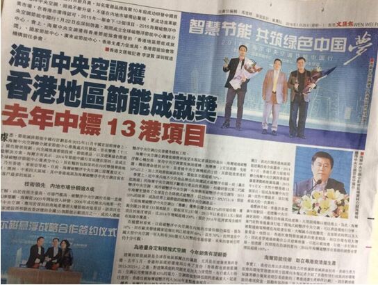 海爾中央空調(diào)獲香港地區(qū)節(jié)能成就獎(jiǎng)