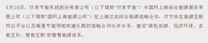 雙良節(jié)能與國網(wǎng)上海綜合能源服務公司達成戰(zhàn)略合作,依托能源互聯(lián)網(wǎng)平臺對上海市內新建及改造的工商業(yè)項目中在暖通節(jié)能減排等綜合能源服務領域采用節(jié)能運營托管、合同能源管理、暖通配套工程總承包等形式,充分利用公司優(yōu)勢產品、設計及智慧運維云平臺,通過調適節(jié)能、管理節(jié)能、產品節(jié)能、系統(tǒng)節(jié)能四個維度助力國網(wǎng)上海能源公司的能源新戰(zhàn)略。