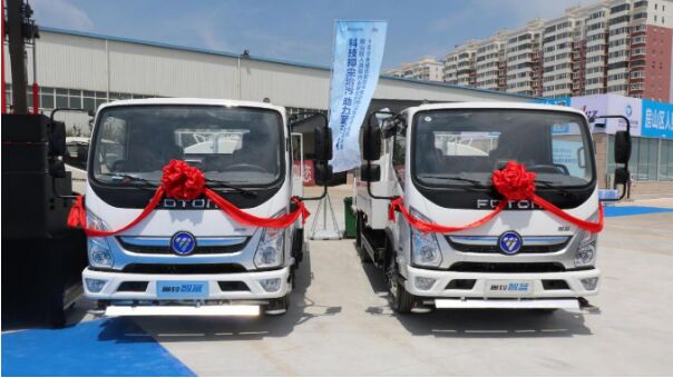 【活動(dòng)現(xiàn)場(chǎng)準(zhǔn)備交付的福田智藍(lán)新能源抑塵車產(chǎn)品】
