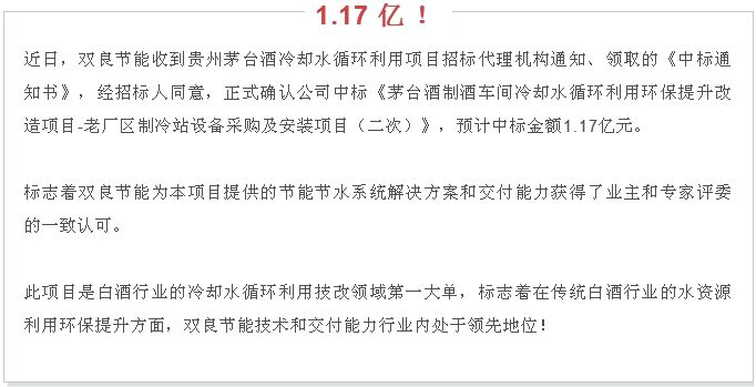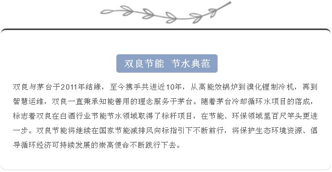 經(jīng)過雙良節(jié)能全體員工的共同努力,茅臺冷卻循環(huán)水項目順利投用。茅臺酒制酒車間冷卻水循環(huán)利用提升改造項目,是貴州茅臺酒股份有限公司“十三五規(guī)劃”中強化生態(tài)建設(shè)和節(jié)能減排的重點項目,在堅守茅臺酒傳統(tǒng)釀酒工藝下歷時了8年的研究與試驗,如今得以建成,實現(xiàn)了赤水河寶貴水資源的循環(huán)利用,對保護赤水河生態(tài)起到積極的示范和引領(lǐng)作用。 雙良節(jié)能中標(biāo)《茅臺酒制酒車間冷卻水循環(huán)利用提升改造項目——中華片區(qū)制冷站設(shè)備采購及安裝項目》,該項目通過對制酒生產(chǎn)冷卻水的循環(huán)利用改造,實現(xiàn)了釀酒傳統(tǒng)工藝的堅守和環(huán)保標(biāo)準提升的高度融合。