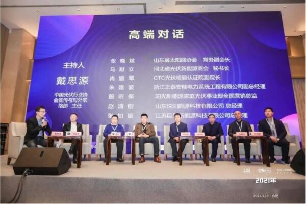 中國光伏行業(yè)協(xié)會宣傳與對外聯(lián)絡(luò)部主任戴思源主持上午的對話環(huán)節(jié)。山東省太陽能協(xié)會常務(wù)副會長張曉斌、河北省光伏新能源商會秘書長馬獻(xiàn)立、CTC光伏檢驗認(rèn)證院副院長肖鵬軍,浙江正泰安能電力系統(tǒng)工程有限公司副總經(jīng)理朱建波、陽光新能源家庭光伏事業(yè)部全國營銷總監(jiān)殷宗保、山東悅陽能源科技有限公司總經(jīng)理趙清剛,江蘇巨擘新能源科技有限公司總經(jīng)理張加振參加本次對話環(huán)節(jié)。與會嘉賓對重點省份戶用光伏市場分析與預(yù)測、平價時代戶用光伏品牌企業(yè)發(fā)展戰(zhàn)略、戶用光伏電站質(zhì)量標(biāo)準(zhǔn)體系、“孤兒電站”售后運維管理、進(jìn)行交流并對平價時代戶用光伏的商業(yè)模式進(jìn)行討論。