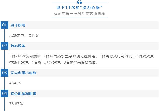 河北華電石家莊第一醫(yī)院(現(xiàn)稱(chēng)石家莊市人民醫(yī)院)燃?xì)夥植际侥茉错?xiàng)目采用以天然氣為基礎(chǔ)能源的先進(jìn)的第三代冷、熱、電三聯(lián)供技術(shù),為醫(yī)院提供制冷、采暖、供電、生活熱水以及醫(yī)用蒸汽綜合能源服務(wù),是國(guó)內(nèi)首批“自發(fā)自用、并網(wǎng)不上網(wǎng)”的天然氣分布式能源項(xiàng)目,機(jī)組配置優(yōu)化,兩個(gè)“欠匹配”,回歸分布式本質(zhì)功能屬性,引領(lǐng)示范效應(yīng)顯著。項(xiàng)目由華電分布式能源工程技術(shù)有限公司承建,建成后由石家莊華電供熱集團(tuán)有限公司負(fù)責(zé)運(yùn)營(yíng)。 該項(xiàng)目的建設(shè)是落實(shí)國(guó)家節(jié)能政策,建設(shè)節(jié)約型社會(huì),實(shí)現(xiàn)可持續(xù)發(fā)展戰(zhàn)略的需要,功能是為石家莊第一醫(yī)院項(xiàng)目提供冷、熱、電、蒸汽綜合能源服務(wù),滿(mǎn)足醫(yī)院對(duì)能源的實(shí)際需求;夏季冷熱電聯(lián)供運(yùn)行時(shí),發(fā)電機(jī)組的高溫冷卻水可根據(jù)用能需求用于制冷或供熱,運(yùn)行控制先進(jìn)適應(yīng)性強(qiáng);低溫?zé)煔庥糜谥迫∩顭崴,排煙溫度低,能源綜合利用率高,該項(xiàng)目引入市政熱網(wǎng)作為采暖季熱源之一。 該項(xiàng)目建成后,與同容量常規(guī)燃煤熱電廠相比,年節(jié)約標(biāo)煤2974.35t/a,節(jié)能率為27%;年CO₂減排12156.18t/a,減排率為48%,具有較好的經(jīng)濟(jì)和環(huán)境效益。設(shè)備滿(mǎn)足節(jié)能減排,提高經(jīng)濟(jì)效率的需要,對(duì)區(qū)域環(huán)境改善作用巨大。