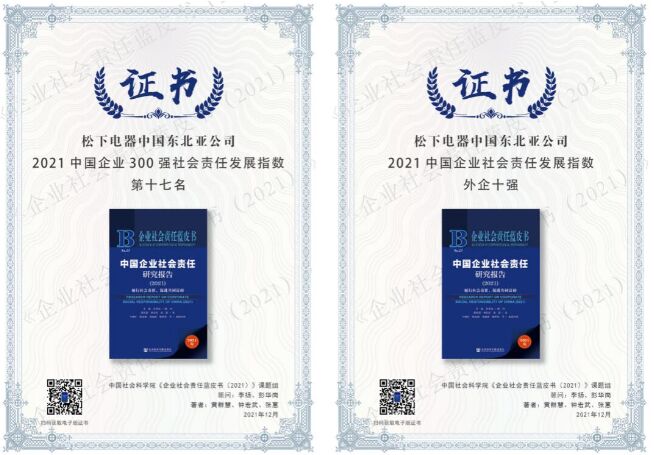 2021年12月3日,由中國社科院舉辦的“第十三屆《企業(yè)社會責(zé)任藍皮書》發(fā)布會”在京舉辦。在本次活動中,發(fā)布了最新的中國企業(yè)300強(國企、民企、外企)社會責(zé)任發(fā)展指數(shù)排名,松下電器取得了總排名第17位,外企第3名的優(yōu)異評價。