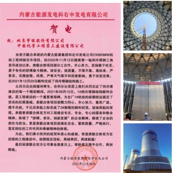 12月21日,在一陣陣鞭炮禮花聲中,由雙良節(jié)能承建的內(nèi)蒙古能源集團科右中發(fā)電廠2X660MW機組工程間接空冷項目,順利完成2#機組鋼結(jié)構(gòu)間冷塔塔體封頂。至此兩座鋼結(jié)構(gòu)間冷塔全部完成封頂,為電廠按期投運打下了堅實的基礎(chǔ)。