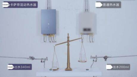 面對這類痛點(diǎn),什么樣的熱水器能夠解決呢?4月22日,卡薩帝官方平臺發(fā)布一段熱水器天平實(shí)驗(yàn)視頻。視頻顯示,卡薩帝「混動」熱水器和普通熱水器在同時開啟10分鐘后,工作人員用兩個量杯分別接10s熱水放在天平上。可見,前者量杯中接出的水量多,天平朝前者傾斜。相同時間運(yùn)行的熱水器,為什么出水量不同?差別在于兩臺熱水器的科技不同。