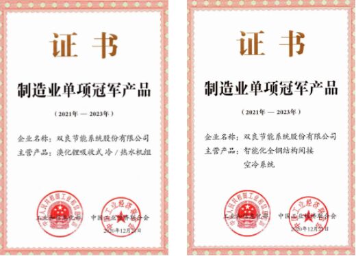 雙良溴化鋰吸收式冷/溫水機(jī)組、智能化全鋼結(jié)構(gòu)間接空冷系統(tǒng),榮獲由工信部、中國(guó)工業(yè)經(jīng)濟(jì)聯(lián)合會(huì)共同頒發(fā)的“中國(guó)制造業(yè)單項(xiàng)冠軍產(chǎn)品”證書。