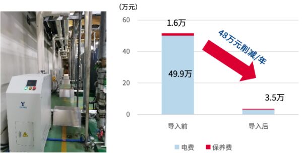 經(jīng)過(guò)上述改造,電費(fèi)和保養(yǎng)費(fèi)每年可削減48萬(wàn)元,并減少663噸CO₂的排放,2年即可收回投資。
