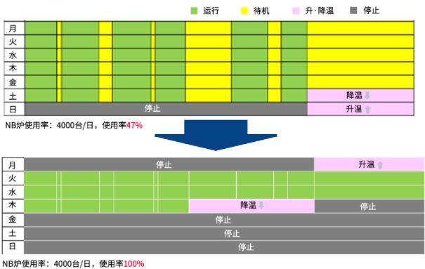 秉承著精益生產(chǎn),消除所有浪費(fèi)的生產(chǎn)理念,電裝著手于提高能源利用效率,消除浪費(fèi)的生產(chǎn)改善措施。通過(guò)將耗能最大的NB爐設(shè)備的生產(chǎn)狀態(tài)可視化并結(jié)合計(jì)劃進(jìn)行集中生產(chǎn),連續(xù)運(yùn)行NB爐,削減待機(jī)時(shí)間。通過(guò)上述消除浪費(fèi)的節(jié)能行動(dòng),NB爐的使用率從原本的47%提升至100%。大幅提高能源利用率和員工工作效率,減少工時(shí)和待機(jī)時(shí)間,從而促進(jìn)實(shí)現(xiàn)生產(chǎn)據(jù)點(diǎn)的降本增效。