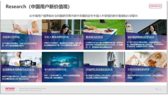 特別是年輕一代已經成為車市的消費主力,其消費觀念與此前存在巨大差異。2022年上半年,電裝針對Z世代(1995-2009年出生)年輕人群開展了一次針對性的調研活動。通過問卷調調查、用戶訪談、專家訪談,以及對未來需求的共創(chuàng)討論發(fā)現(xiàn),中國年輕人對座艙的需求主要反映在以下幾個方面:第一,追求科技感的設計;第二,追求更多的車內可自定義功能;第三,是對智能化的需求,希望車能主動感知人的狀態(tài),主動感知車內車外的環(huán)境,然后主動提供各種功能跟服務。