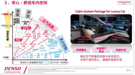 延伸至汽車座艙領域,電裝希望通過人性化的顯示設置、提供優(yōu)質空氣,創(chuàng)造出令人安心舒適的車內空間;運用AI系統(tǒng)預測危險場景、在不過度干擾駕駛的狀態(tài)下通過HUD、液晶儀表等顯示設備向駕駛員提供信息,進而消除交通事故實現(xiàn)自由出行!半娧b的目的是運用豐富的經驗和技術,通過系統(tǒng)整合最終實現(xiàn)便利性、舒適性和美感三大價值。”邵旻說。
