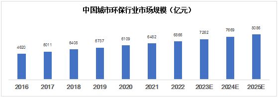 自2020年起,我國環(huán)保行業(yè)的營業(yè)收入占 GDP的比例便已達(dá)到并維持在2%左右。根據(jù)市場調(diào)研在線網(wǎng)發(fā)布的分析報告顯示,2016年中國城市環(huán)保行業(yè)市場規(guī)模為4620億元,2022年已達(dá)6866億元,并將在 2025年達(dá)到8086億元。