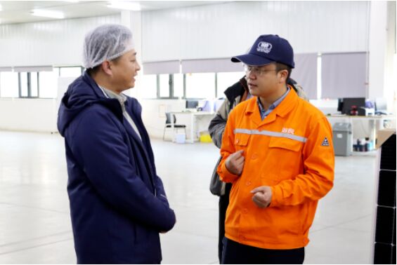 葉建群帶領王海生一行參觀了雙良新能科技高效光伏組件生產(chǎn)現(xiàn)場及雙良硅材料展廳,并對園區(qū)整體情況、生產(chǎn)流程及超級光能高效光伏組件產(chǎn)品優(yōu)勢進行了詳細的介紹。