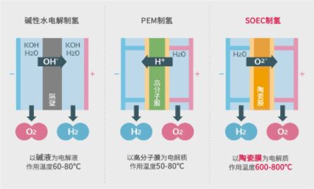 水產(chǎn)生氫的水電解方法有堿性水電解制氫、PEM(Polymer Electrolyte Membrane/固體高分子電解質(zhì)膜)制氫等幾種方式。由于水具備在溫度越高越能在低電壓下分解的性質(zhì),因此與在60℃左右反應(yīng)的堿性水電解制氫、PEM制氫不同,SOEC所使用的陶瓷材料可在約700℃高溫下反應(yīng),制氫所需的能耗也會對應(yīng)削減。