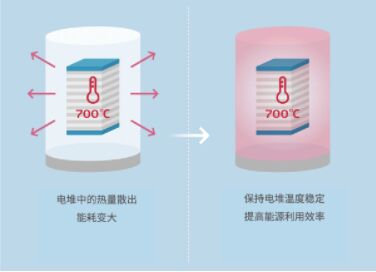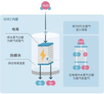 SOEC的電解模式是將該電堆放入用絕熱材料包裹的高溫機器“熱模塊”中,并向其中送入700℃高溫的水蒸氣來進行電解。