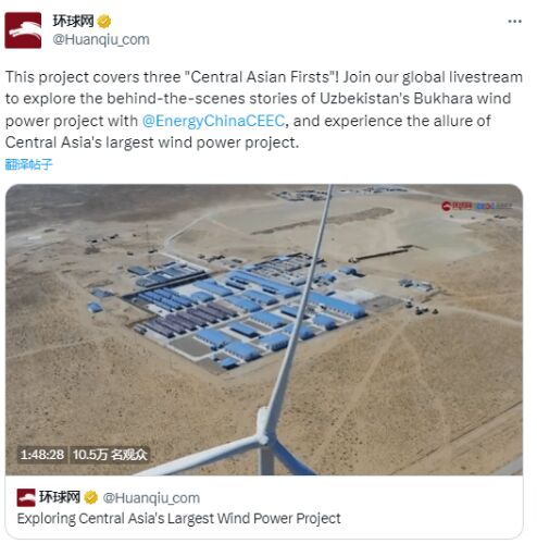 2013年9月,共建絲綢之路經(jīng)濟(jì)帶重大倡議提出,至今已整十年。在這重要?dú)v史節(jié)點,環(huán)球網(wǎng)聯(lián)合中國能建于北京時間9月25日16:00策劃了“風(fēng)起絲路,電連天涯:探秘中亞第一大風(fēng)力發(fā)電項目”海外直播活動,通過臉書、推特等海外社交媒體平臺,帶領(lǐng)全球觀眾一起聆聽烏茲別克斯坦布哈拉風(fēng)電項目建設(shè)的幕后故事,近距離感受中國企業(yè)為推動世界綠色低碳發(fā)展做出的切實行動,見證“一帶一路”上建設(shè)者們的風(fēng)采。