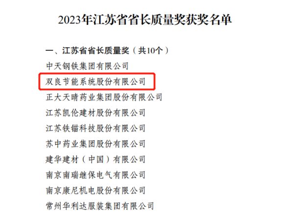 近日,2023年江蘇省省長(zhǎng)質(zhì)量獎(jiǎng)獲獎(jiǎng)名單正式公布,雙良節(jié)能系統(tǒng)股份有限公司憑借多年來(lái)在踐行綠色發(fā)展和推動(dòng)高質(zhì)量發(fā)展方面的堅(jiān)守與擔(dān)當(dāng),贏得了江蘇省人民政府的肯定與嘉獎(jiǎng),榮獲2023年江蘇省省長(zhǎng)質(zhì)量獎(jiǎng)。