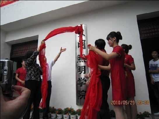圖為中國照明協(xié)會秘書長劉昇平女士、荊州市副市長張文政先生與荊州市大明燈業(yè)有限公司董事長倪功大先生為沙市職業(yè)大學(xué)“大明照明學(xué)院”揭牌