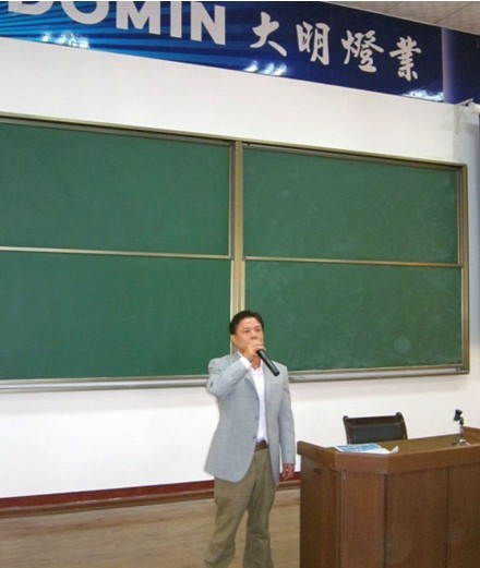 大明燈業(yè)營銷總監(jiān)文純陽在演講臺上