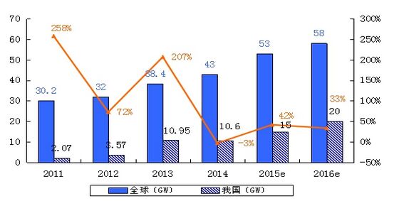 圖1 2011-2016年我國光伏新增裝機量、增長率及全球新增裝機量